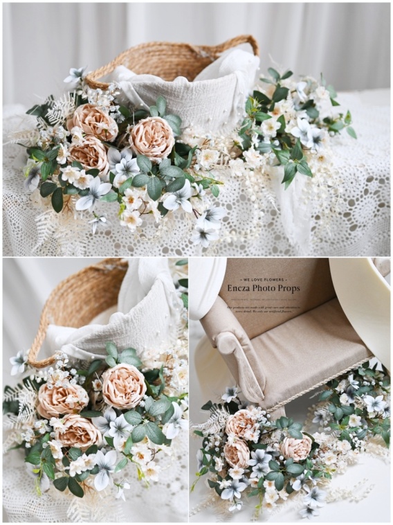 Guirlande pour les séances de nouveau-nés faite de fleurs artificielles de haute qualité.
